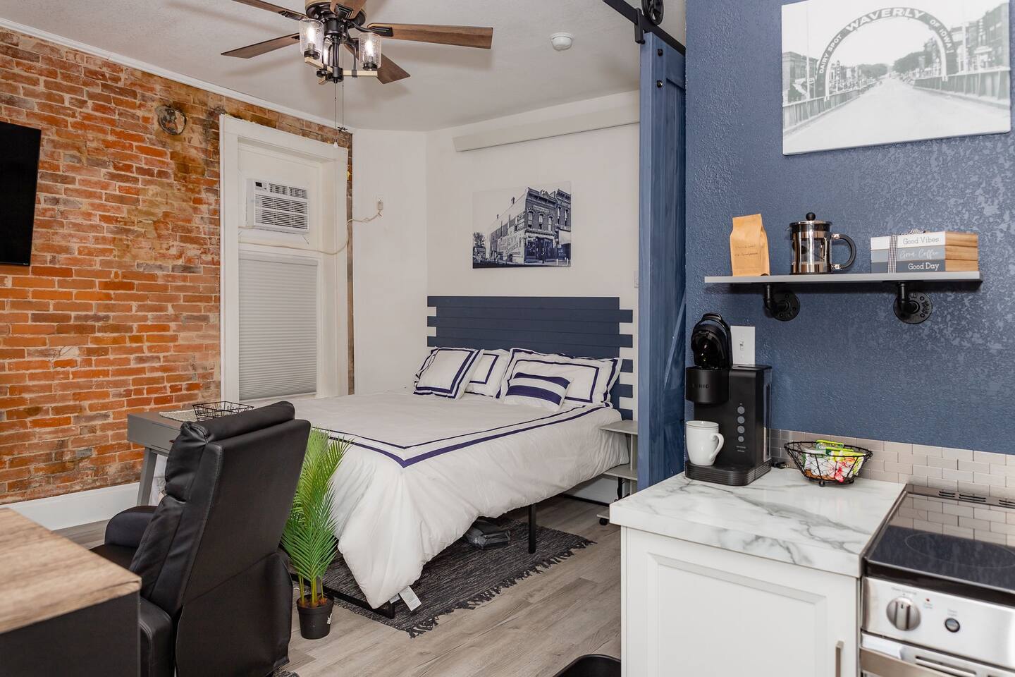 Welcome to Studio C, a cozy 320 sqft. downtown studio apartment that has been completely remodeled to compliment the charm of our downtown area with exposed brick and all new appliances! While Studio C is small, it has the essentials and luxuries needed to make your stay comfortable! Centrally located in the heart of Waverly and within walking distance to restaurants, shopping, grocery stores and the bike trail. Studio C is accessible by a set of 20 stairs that may be too steep for some.
