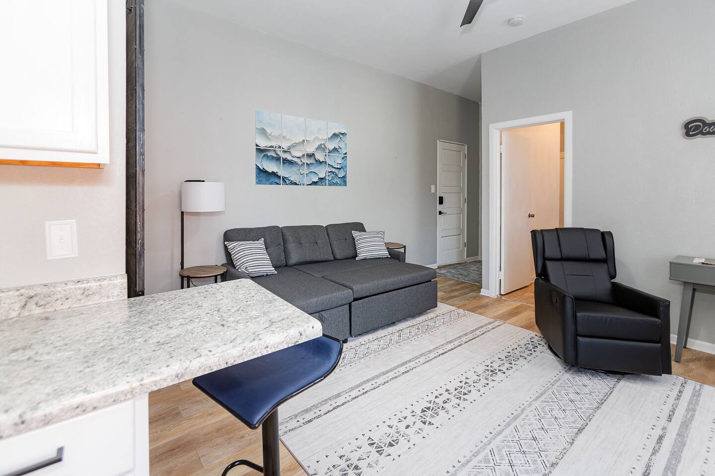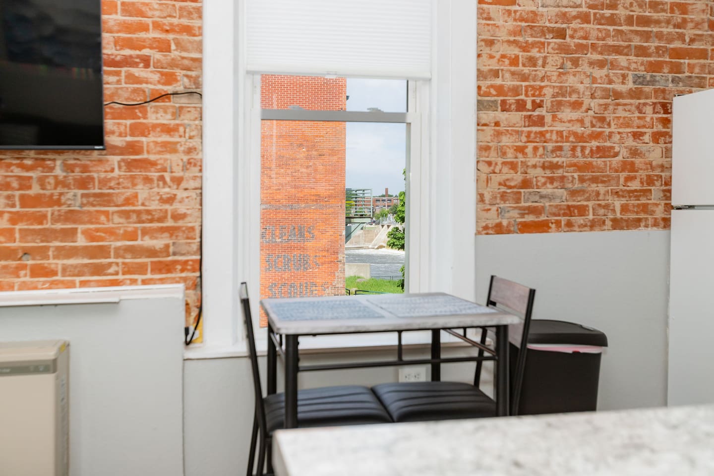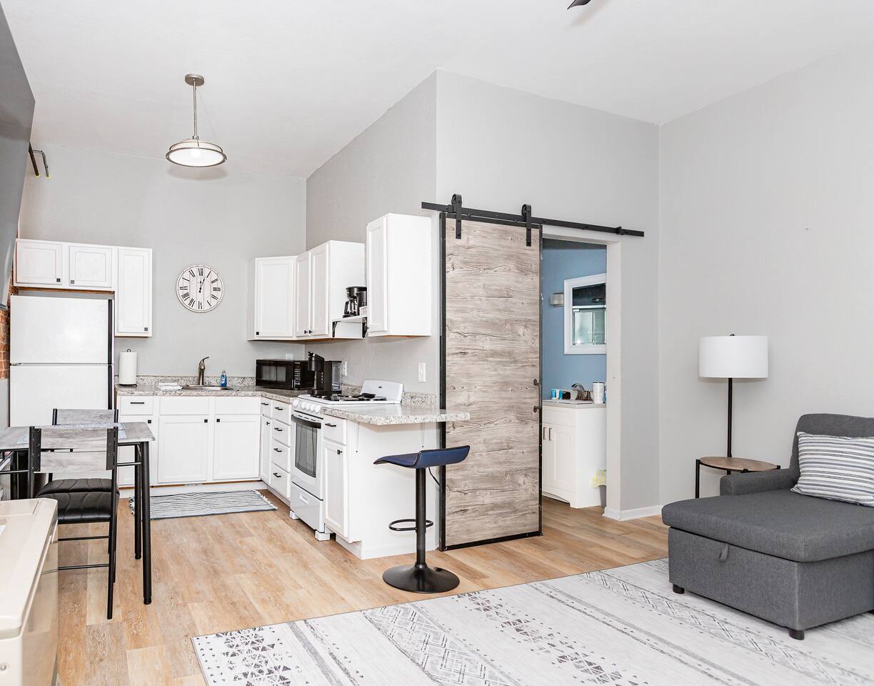 ***Apartment B is accessible by climbing a set of 20 stairs that may be steep for some. If you have any issues with mobility this is not a good fit for you.*** *While we do allow up to three guests, this apartment is best suited for two adults. Please note that the kitchen table seats two, only one bed and a small pull out section (79” x 53”) makes the sleeping arrangements compact, but if you’re like our family and don’t need a lot of space this may be a good fit for a small family. *We do not own or have any control over the stairs leading to the apartment. It is a public hallway shared by other tenants within the apartment building. *Fully equipped kitchen with pots/pans, utensils, silverware, dishes, etc. including a table for two. *California King 12 Inch Mattress with Gel Memory Foam *Frameless round shower enclosure *Washer/dryer combo *58” ROKU TV * L Shaped Sectional Couch with convertible bed *Recliner for comfortable seating *Writing desk and ottoman *View and sounds of the river from across the road *Conveniently located to local shops, restaurants, the river and bike trail. Wartburg College and the Waverly Hospital are just a short drive across town while Cedar Falls UNI-Dome or Lost Island Theme and Waterparks are also a short drive at 2o miles away. *Paper towels, garbage bags, dish soap, hand soap and toilet paper are provided but please bring your own toiletries Apartment B POLICIES: -No smoking/vaping and any signs indicating smoking/vaping inside the apartment or building will result in a $150 fee -No pets -No parties -No tampering with the locks or wifi as this will result in the immediate termination of your stay with no refund Apartment B checkout: -Make sure you have all of your belongings when you check out as we are not responsible for returning any items that get left behind -Please lock the door on your way out